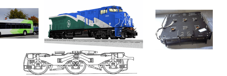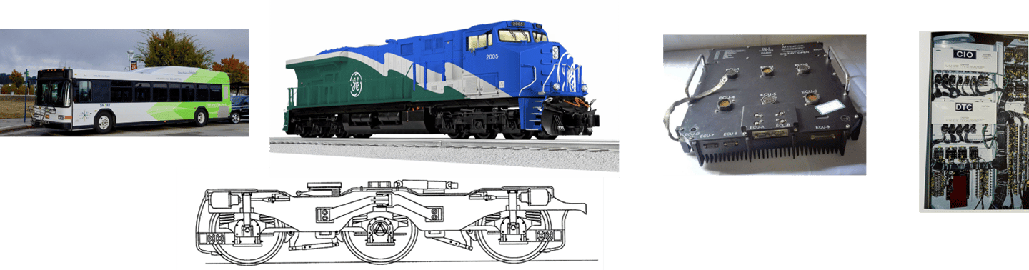 Rail/road vehicle dynamics (suspension, ride quality/stability), locomotive auxiliary electric drive & battery charging systems, locomotive control systems (traction, braking, powertrain, auxiliary, cooling, charging) and diagnostics