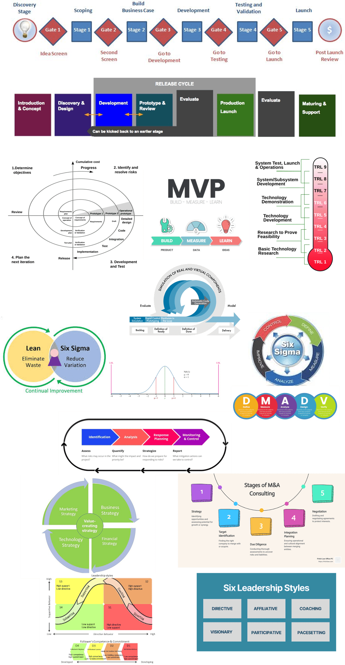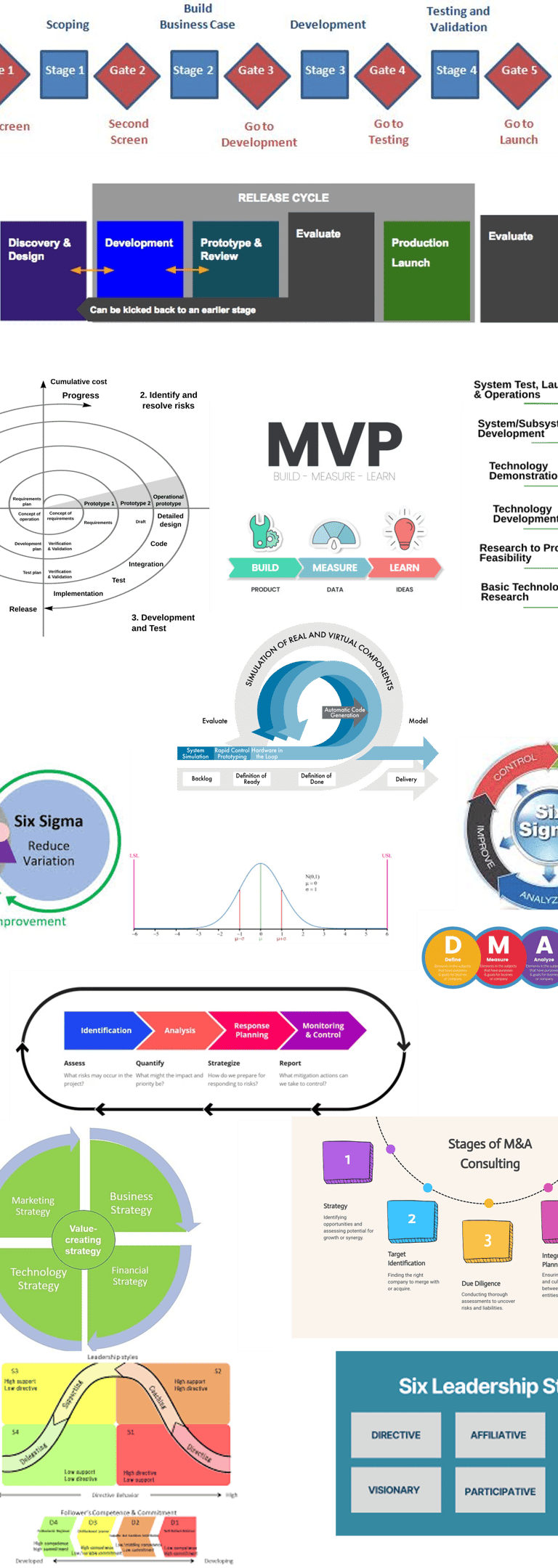 State gate process, Spiral model, and Technology readiness level illustrations - wikipedia; MVP (Minimum Viable Product) - peformixbiz.com; model based design illustration - mathworks.com; Lean and Six Sigma - transform-your-business.com; 6 sigma/normal distribution - wikipedia; Six Sigma methodology - qualitymag.com; DMADV - freepik.com; project risk management - stablelogic.com; Value creating strategy - wikipedia; M&A consulting - fritchlaw.com; Situational leadership - wkipedia; 6 Styles of leadership - reallearning.com.au