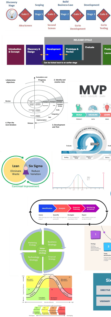 State gate process, Spiral model, and Technology readiness level illustrations - wikipedia; MVP (Minimum Viable Product) - peformixbiz.com; model based design illustration - mathworks.com; Lean and Six Sigma - transform-your-business.com; 6 sigma/normal distribution - wikipedia; Six Sigma methodology - qualitymag.com; DMADV - freepik.com; project risk management - stablelogic.com; Value creating strategy - wikipedia; M&A consulting - fritchlaw.com; Situational leadership - wkipedia; 6 Styles of leadership - reallearning.com.au